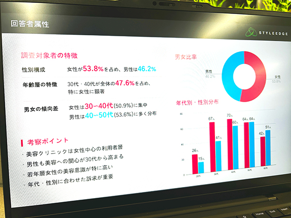 株式会社スタイル・エッジ 代表取締役社長・島田雄左氏(以下、島田氏):今回の調査で利用者の46%が男性という数字を見て、消費者意識の大きな変化を感じました。韓流ブームなど、メディアの影響も大きいとは思いますが、本当にちょっと前まではまったくそんな意識はなかったと思いますから。